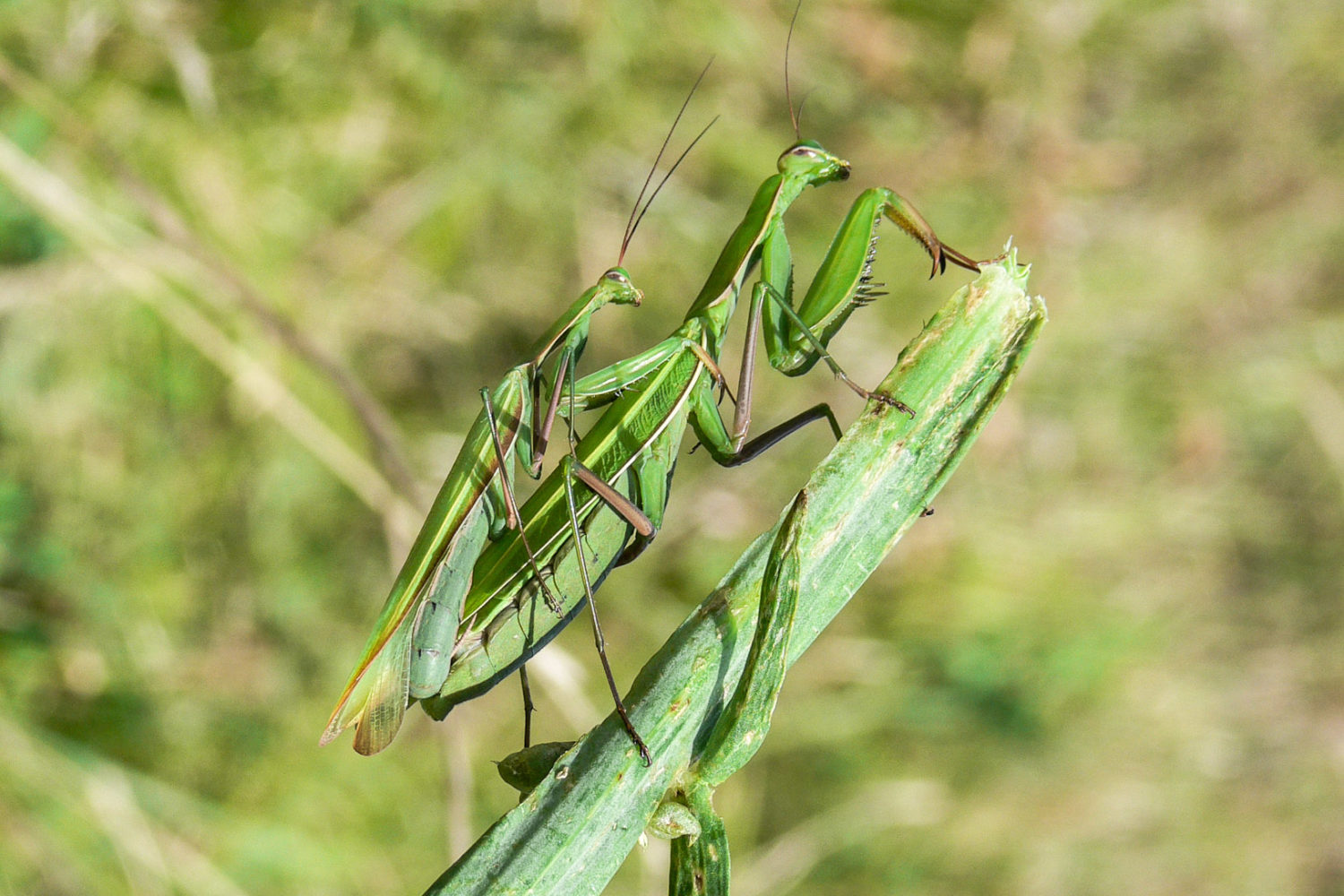 Accouplement de Mantes religieuses. Dans quelques minutes, le mêle (sur le dessus) a de grandes chances d’être dévoré par la femelle. Coupling of Praying mantis