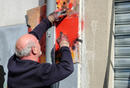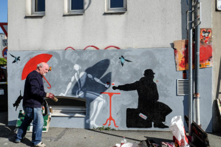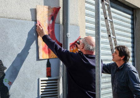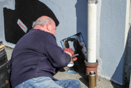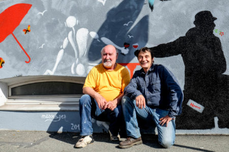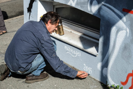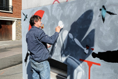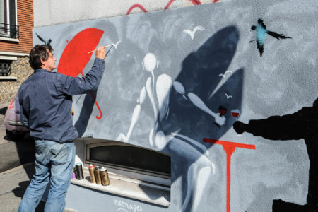 Nous avons pu assister à la réalisation en direct d’une oeuvre des deux célèbres artistes de rue parisiens , Némo (L’homme à l’imperméable noir) et Jérome Mesnager (l’homme blanc), pour la création d’un graff cosigné. Cela se déroulait ce week-end dans le cadre du Street Art festival de Montreuil, qui offre ses murs a de nombreux graffeurs. Pour les amateurs, ce nouveau graffiti est situé au 82 rue Alexis Lepere.